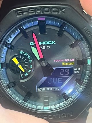 Reloj Casio G-SHOCK con un diseño moderno y resistente. Combina funcionalidad y estilo. - Esfera con detalles en verde. - Correa de resina negra. - Resistente a golpes y al agua 20 BAR. - Tough-solar - Iluminación LED - Bluetooth - Esta en perfecto estado - Con su caja correspondiente, factura de compra y tarjeta de garantía - Comprado el 10/3/25