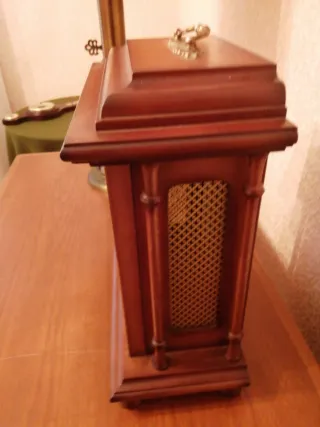 Elegante reloj de sobremesa con detalles en madera y latón. Su diseño clásico lo hace perfecto para cualquier estancia. - Esfera con números romanos. - Asa decorativa en la parte superior. - Base con patas. Alto 0,88 ancho 0,31 x0, 15