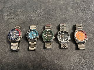 Conjunto de cinco relojes Seiko con diferentes diseños y colores. - Reloj con bisel azul y rojo. - Reloj con esfera azul y bisel negro. - Reloj con esfera verde y bisel negro. - Reloj con esfera negra y bisel gris. - Reloj con esfera naranja y bisel rojo. - LOS PRECIOS ESTAN EN LA SEGUNDA FOTO