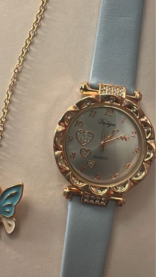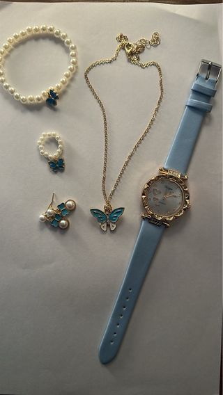 Conjunto de collar con colgante de mariposa y reloj. Incluye: reloj, pulsera, anillo, pendientes y collar. Color: azul cielo + dorado + perlas. Estado: nuevo sin uso. Material: bisutería (no acero inoxidable). Ideal como regalo para niña o adolescente No recomendado para piel muy sensible.