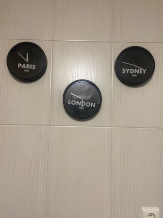 Conjunto de tres relojes de pared con diseño moderno. - Relojes con nombres de ciudades: Paris, London, Sydney. - Esferas en color negro con detalles en blanco. - Mecanismo de cuarzo.
