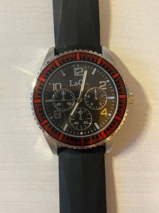 Reloj con correa de silicona negra y detalles en rojo. - Esfera negra con cronógrafos. - Bisel con detalles en rojo.