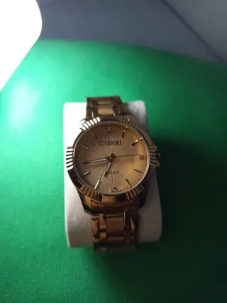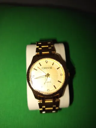 CON PILA Y PRECIO NEGOCIABLE 🛑 🛑 Elegante reloj de pulsera con un diseño clásico y sofisticado. - Esfera de color dorado con detalles texturizados. - Correa de metal a juego. - Indicador de fecha.