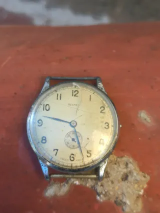 🇨🇭RELOJ RESNELL🇨🇭no funciona,volante en mal estado,cristal roto,esfera envejecida,le falta la tija y la corona,segundero a las 6,medida 38 mm,cualquier duda preguntar.