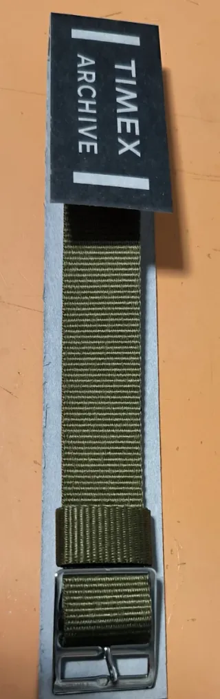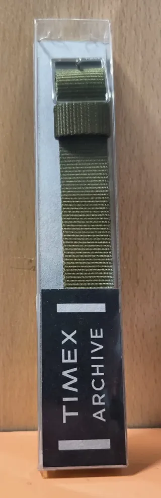 Correa de repuesto para reloj Timex en color verde oliva. Presentada en su empaque original. - Material textil resistente. - Hebilla metálica. - Diseño clásico.
