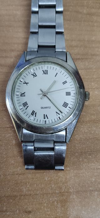 Elegante reloj de pulsera con un diseño clásico y atemporal. - Correa de metal plateado. - Esfera redonda de color blanco. - Indicadores horarios con números romanos. - Mecanismo de cuarzo.