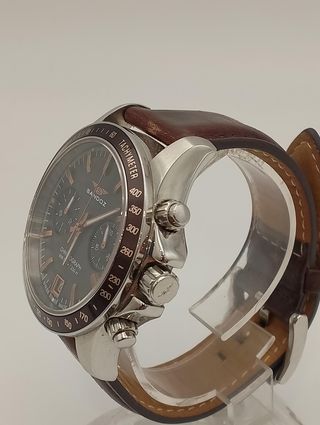 Reloj de pulsera con correa de cuero marrón y detalles plateados en la esfera. - Correa de cuero. - Esfera con múltiples indicadores. - Resistente al agua 200m/660ft.