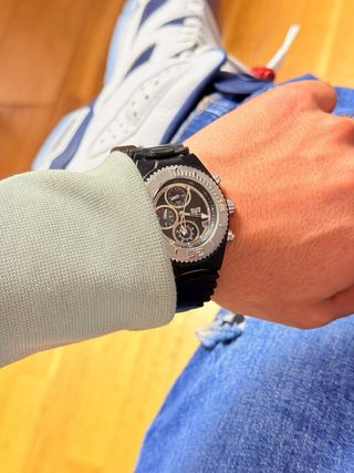 Reloj Swatch con diseño deportivo y esfera negra. - Caja y correa de color negro. - Detalles plateados en la esfera y bisel. - Funciones de cronógrafo.