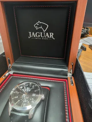 Elegante reloj Jaguar para caballero, con una combinación de colores plateado y negro. - Caja de acero inoxidable. - Correa de piel negra con pespuntes. - Esfera con detalles texturizados y números arábigos. Nuevo 300€