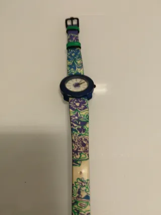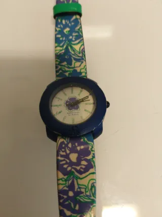 Reloj con un diseño llamativo y juvenil. - Correa con estampado floral en tonos morados y verdes. - Esfera redonda con detalles en azul.