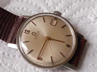 Elegante reloj Omega con esfera beige y detalles dorados. - Mecanismo automático. - Correa de cuero burdeos.