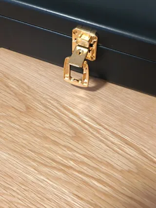 Elegante joyero con capacidad para 6 relojes. Se encuentra en excelente estado. - Diseño rectangular. - Cierre metálico dorado con llave. - Costuras decorativas en contraste.