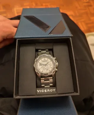 Reloj Viceroy Heat con diseño cronógrafo. Su esfera plateada y bisel gris - Correa de eslabones metálicos. - Bisel giratorio con marcadores. - Tres subesferas para funciones de cronógrafo. -incluye caja y certificado El único problema es q la caja está un poco dañada por lo demás en perfecto estado