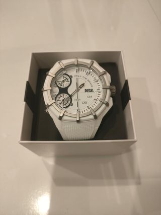 Reloj de la marca Diesel con un diseño moderno y llamativo. - Correa de silicona blanca. - Bisel plateado. - Esfera blanca con detalles plateados.