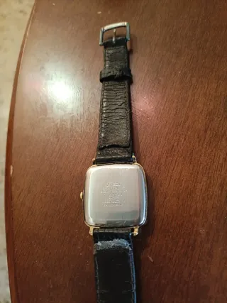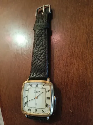 Elegante reloj Citizen original con correa de cuero. - Esfera cuadrada con números romanos. - Correa de cuero negra. - Detalles dorados en la caja.