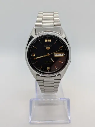 Reloj Seiko 5 con movimiento automático y esfera negra. Incluye documentación opriginal y sellada, junto a su tarjeta de identificación - Caja y brazalete de acero inoxidable. - Indicador de día y fecha.