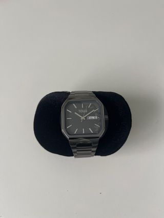 Elegante reloj analógico de la marca Tous. - Diseño moderno con detalles en negro y plateado. - Correa de eslabones. - Ventana de día y fecha.