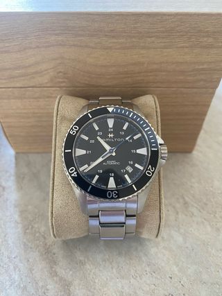 Reloj de buceo Hamilton Khaki Navy Scuba con una esfera negra. Un accesorio elegante y funcional. - Bisel giratorio unidireccional. - Correa de acero inoxidable. - Movimiento automático.