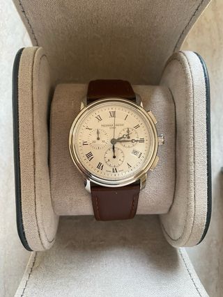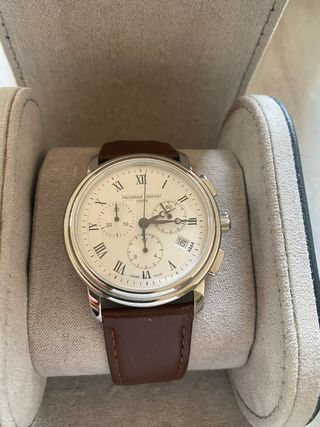Elegante reloj Frederique Constant con correa de cuero marrón y detalles plateados. - Esfera con números romanos. - Función de cronógrafo. - Ventana de fecha. -entrego con dos correas