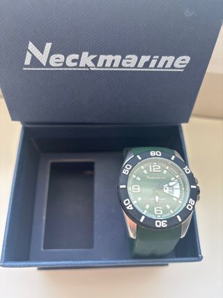 Reloj de la marca Neckmarine con un diseño moderno y deportivo. - Correa de silicona verde. - Bisel negro con detalles plateados. - Esfera verde con marcadores horarios plateados.