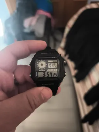 Reloj Casio digital con correa negra. - Diseño moderno y funcional. - Resistente al agua WR100. - Pantalla con iluminación.