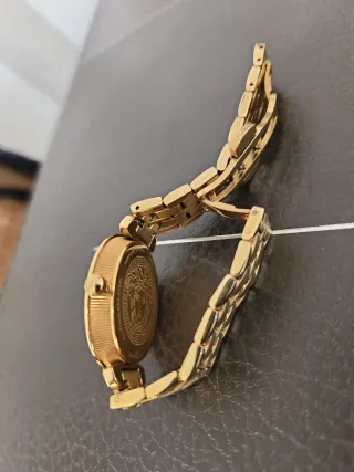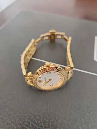 Elegante reloj Versace con detalles dorados y esfera blanca. - Diseño sofisticado. - Brazalete metálico. - Bisel con patrón griego.