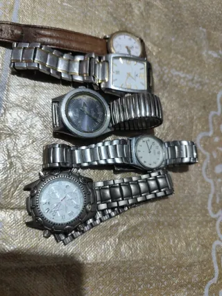 Conjunto de cinco relojes con correas metálicas.el helsa funciona es antimagnético resistente al agua.precio algo negociable - Reloj con esfera cuadrada y detalles dorados. - Reloj con esfera redonda y números romanos. - Reloj con esfera oscura y detalles plateados. - Reloj con esfera blanca y números arábigos. - Reloj cronógrafo con múltiples esferas.