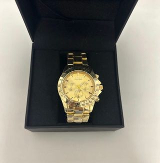 Elegante conjunto de reloj y pulsera. - Reloj con esfera dorada y detalles en negro. - Pulsera a juego con eslabones gruesos.