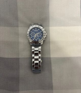 Elegante reloj de pulsera con esfera azul y detalles plateados. - Diseño clásico con correa de metal. - Bisel con acabado estriado. - Indicadores de hora y fecha.