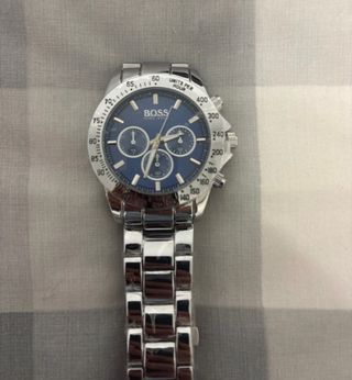 Elegante reloj Hugo Boss con esfera azul y detalles plateados. - Diseño moderno y sofisticado. - Correa de eslabones plateada.