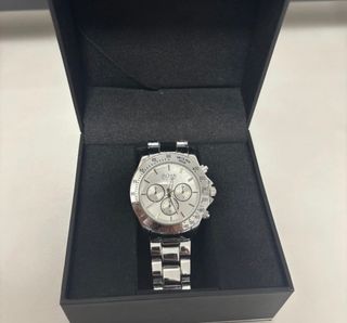 Reloj de pulsera con diseño deportivo y elegante. - Esfera negra con detalles en rojo. - Correa de eslabones plateada. - Ventana de fecha. - Resistente al agua 100m. - Funciona bien.