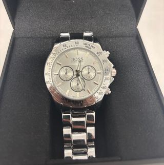 Elegante reloj Hugo Boss con acabado plateado. - Diseño moderno y sofisticado. - Correa de eslabones metálicos.