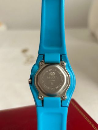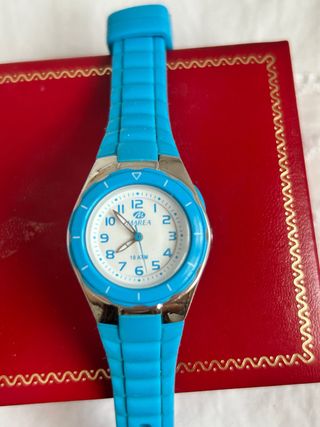 Reloj infantil de la marca Marea con un diseño moderno y llamativo. Hay que poner pila. - Correa de silicona azul. - Bisel plateado. - Esfera blanca con detalles en azul.