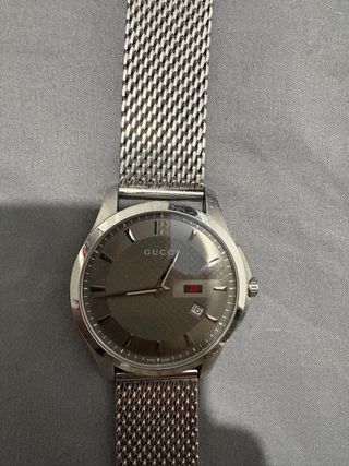 Elegante reloj con correa de malla metálica. - Esfera gris con detalles en la esfera. - Ventana de fecha. - Logo de la marca en la esfera.