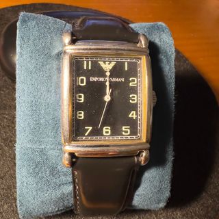Elegante reloj de Emporio Armani con una esfera negra y detalles plateados. - Diseño rectangular clásico. - Correa original de piel negra acharolada. Como nuevo. 100
