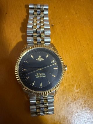 Elegante reloj de pulsera de la marca Vivienne Westwood. - Esfera de color negro. - Detalles y bisel en tono dorado. - Correa combinada en plateado y dorado. Solo le falta la batería