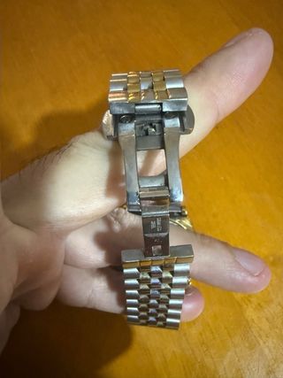 Elegante reloj de pulsera con detalles en oro y plata. -Le cambié la pila recientemente. - Diseño moderno y sofisticado. - Correa de eslabones en acero.