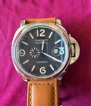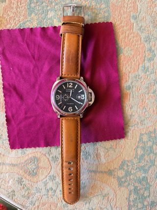 Elegante reloj Panerai Luminor Marina con una esfera negra y detalles plateados. - Correa de cuero marrón. - Caja de acero inoxidable. - Bisel plateado con protector de corona. - Cierre de hebilla. - movimiento automático. Leves arañazos superficiales en el cristal que salen puliendo