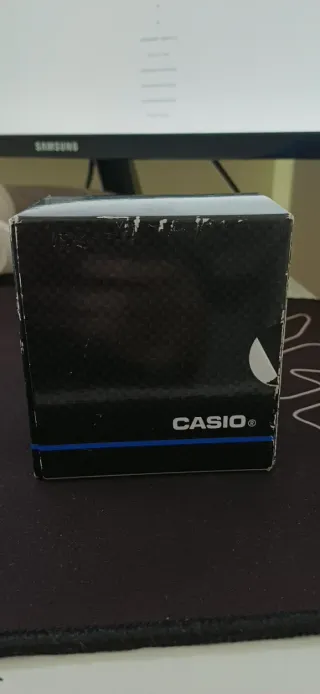 Caja de reloj Casio con un diseño moderno y elegante. - Acabado texturizado en negro. - Detalle de línea azul en la parte inferior.
