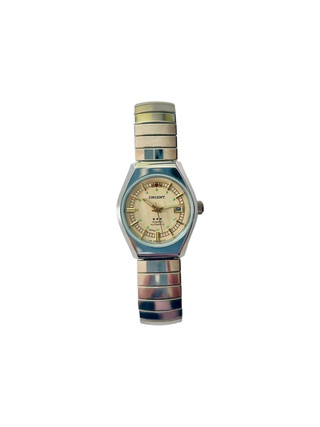 Reloj de pulsera Orient con un diseño elegante y funcional. - Esfera en tono dorado. - Brazalete combinado en dorado y plateado. - Mecanismo automático.