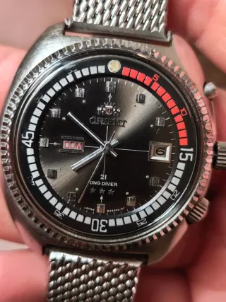 Reloj de pulsera Orient King Diver automático. - Esfera negra con detalles en rojo. - Ventana de día y fecha. - Brazalete de malla metálica cambiado