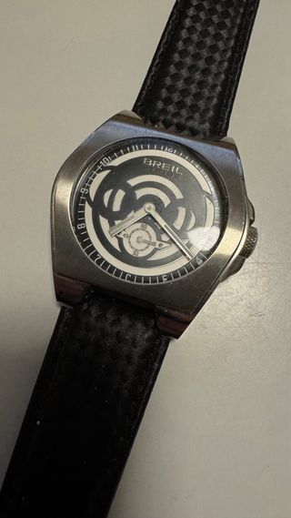 Elegante reloj Breil con un diseño moderno y sofisticado. - Correa de cuero negra con textura. - Esfera plateada con detalles en negro. - Caja de acero inoxidable.