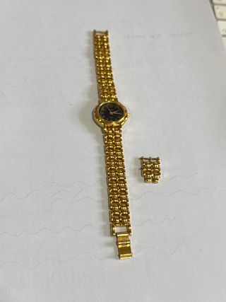 Elegante reloj de señora con acabado dorado. Un accesorio clásico y sofisticado. - Esfera negra. - Brazalete de eslabones dorados.