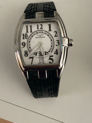 Elegante reloj de la marca Sandoz con un diseño moderno y llamativo. La combinación de colores plateado y negro le da un toque sofisticado. - Esfera blanca con números arábigos. - Correa con diseño inspirado en neumáticos. - Ventana de fecha.FARTA PILA Y LA MITAD DE LA CORREA