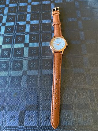 Elegante reloj de pulsera con correa de cuero. - Correa de cuero marrón. - Esfera con detalles dorados. - Cierre de hebilla. Falta cambiar la pilla.