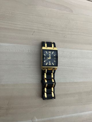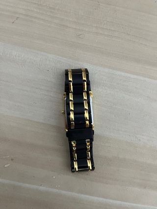 Elegante reloj de estilo clásico con un diseño rectangular. - Esfera con detalles dorados. - Correa con eslabones en contraste.