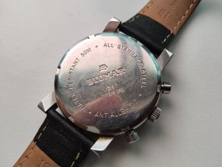 Elegante reloj cronógrafo de la marca Blumar (Modelo 11063B) en excelente estado. Una pieza robusta con maquinaria japonesa de alta precisión, ideal para quienes buscan fiabilidad y estilo. Calibre Seiko/Epson VD57 Pila recién cambiada en enero de 2026. ¡Listo para usar! Caja de acero inoxidable (All Stainless Steel) antialérgica. Funciones: Cronógrafo de tres esferas y ventana de calendario Correa: Piel genuina de 18mm, forro Nobuck antialérgico, muy cómoda. Estado como en las fotos, muy aceptable.