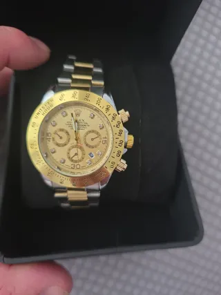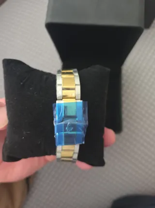 Reloj de pulsera con un diseño elegante que combina tonos dorados y plateados. - Esfera con marcadores horarios dorados. - Ventana de fecha. - Brazalete metálico ajustable. _no tiene pila y una rejilla q se ve en las fotos