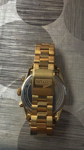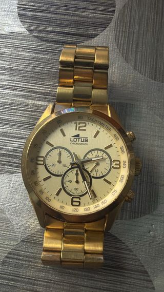 Elegante reloj Lotus con diseño cronógrafo y acabado dorado. - Esfera con detalles en dorado. - Correa de eslabones dorada. - Bisel con escala taquimétrica.