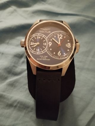 Reloj Sector con doble hora y resistencia al agua. - Esfera azul. - Correa de piel azul - Indicador de 24 horas. - Resistencia al agua de 10 ATM.